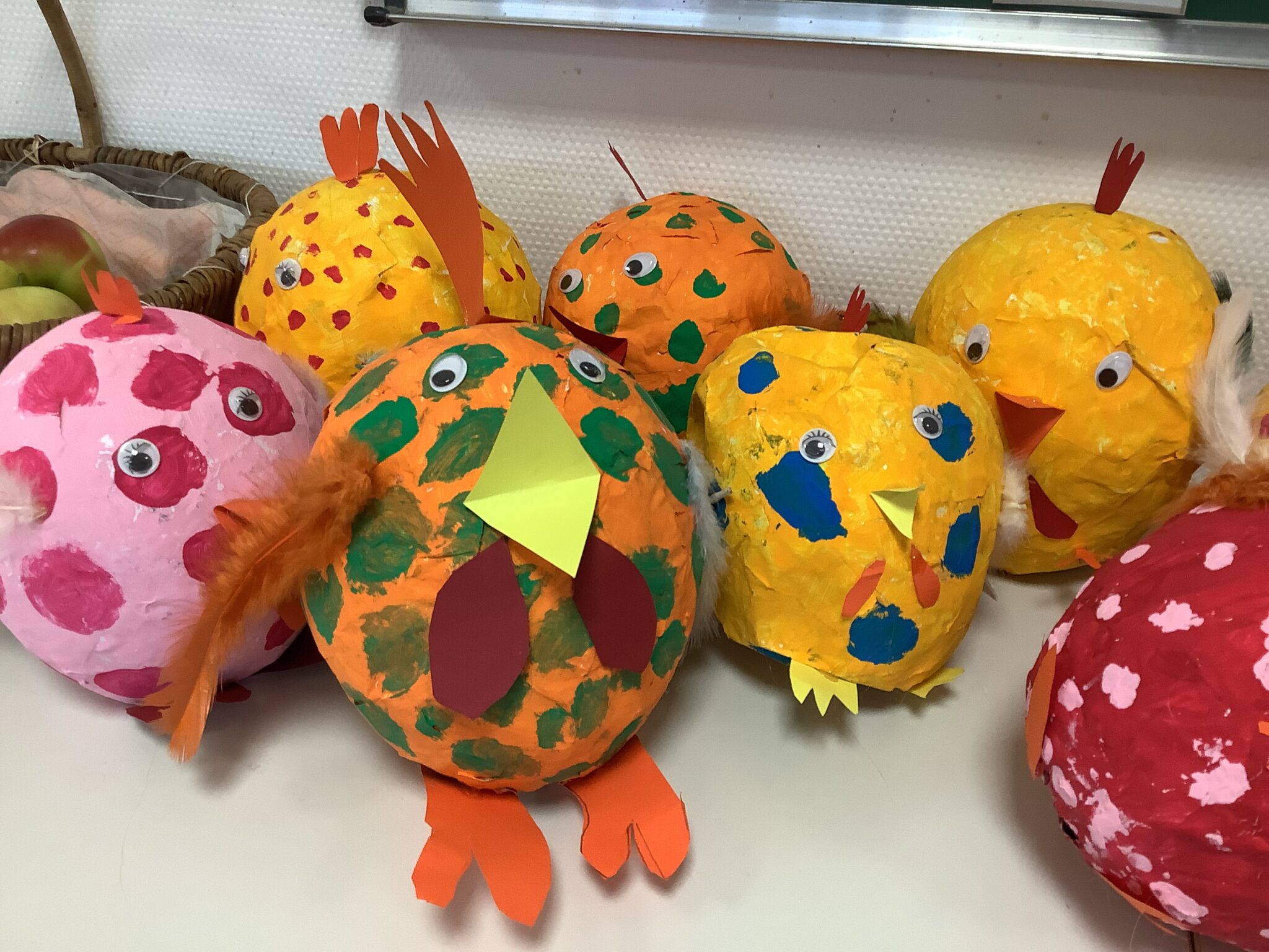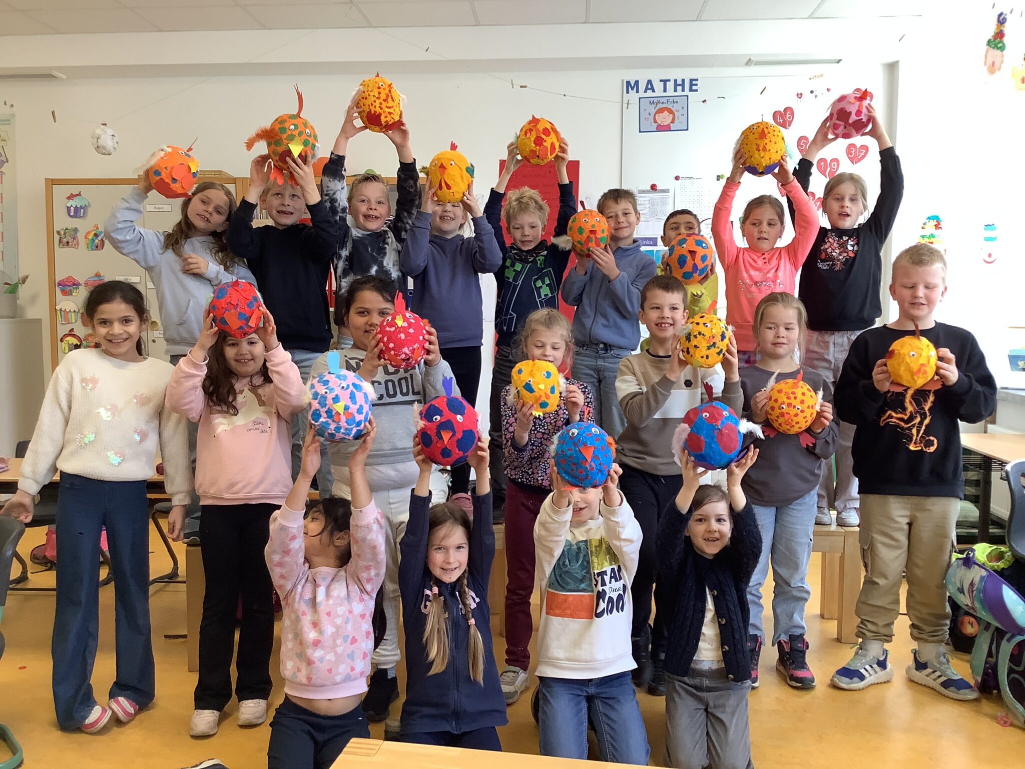 Im Kunstunterricht haben die Schülerinnen und Schüler farbenfrohe Hühner aus Pappmaché gestaltet. Pünktlich zu Ostern wurden die kleinen Kunstwerke fertig und schmücken nun unseren Klassenraum. Ein kreativer und fröhlicher Abschluss vor den Ferien!
