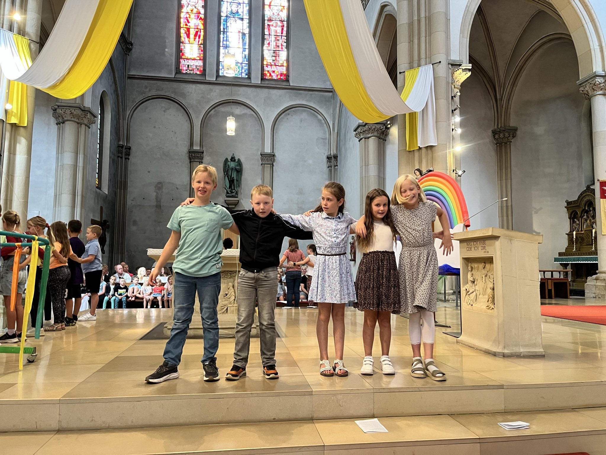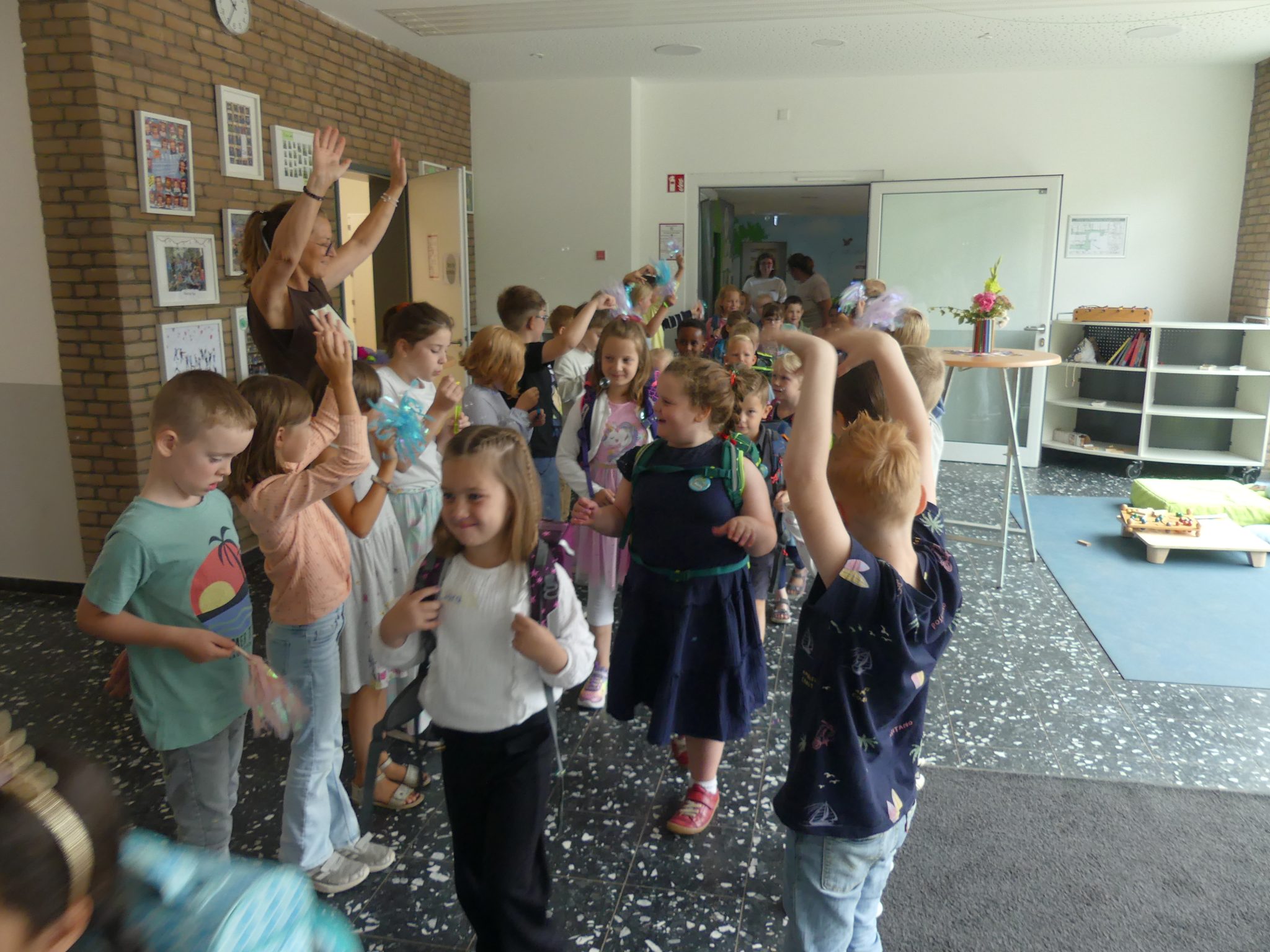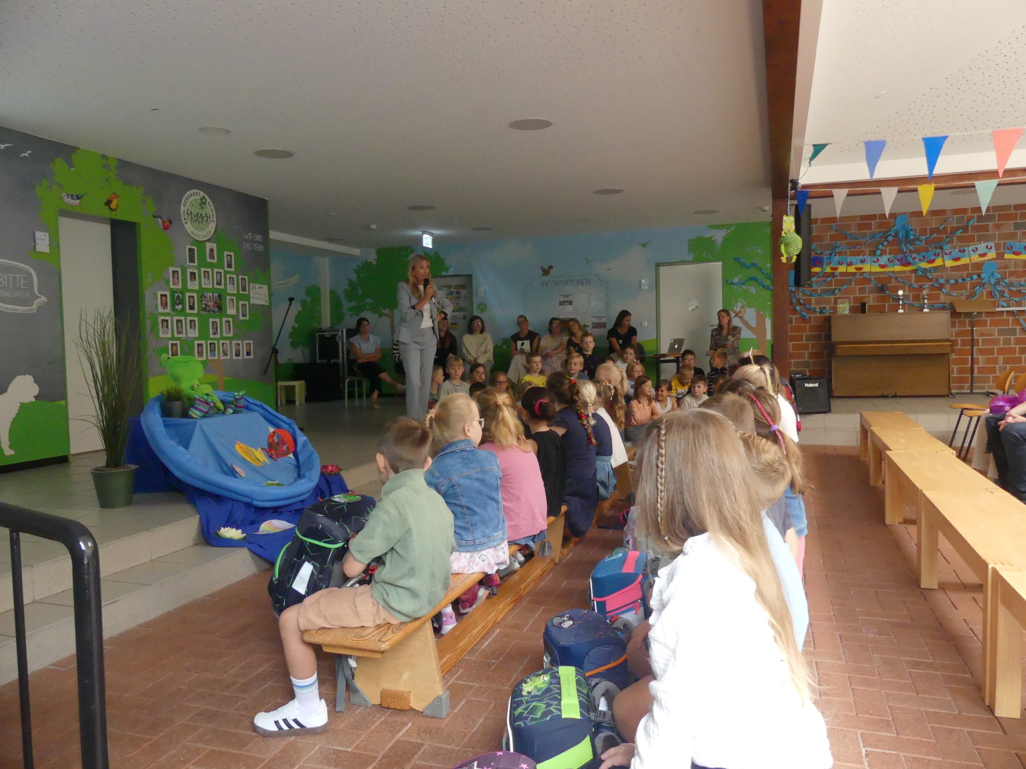 Mit einem fröhlichen und farbenfrohen Gottesdienst und zwei persönlichen Einschulungsfeiern in unserer Aula wurden gestern und heute die neuen Erstklässler an der Paul-Gerhardt-Schule begrüßt. Bereits am Mittwochnachmittag feierten alle Erstklässler gemeinsam mit ihren Eltern, Großeltern und Freunden einen ökumenischen Gottesdienst in der St. Agatha-Kirche. Heute morgen feierten die Klassen 1a, 1b und 1c in der Aula weiter und hörten die Geschichte „Du bist jetzt ein Schulkind. Und du gehörst zu uns!“. Diese wurde ihnen von ihren zukünftigen Paten, den Schülerinnen und Schülern der 3. Klassen, vorgetragen. Im Anschluss hatten die Kinder ihre allererste Schulstunde in ihrem Klassenraum. Wir, das sind alle Kinder, Lehrerinnen und Lehrer und Mitarbeiterinnen und Mitarbeiter, heißen die I-Männchen herzlich willkommen und wünschen ihnen eine tolle Schulzeit an der Paul-Gerhardt-Schule!